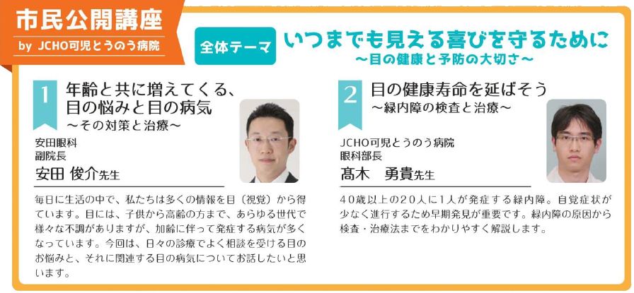 今回の市民公開講座はメインテーマを「いつまでも見える喜びを守るために 目の健康と予防の大切さ」とし座長に西村眼科院長 西村幸三九先生、講師に当院眼科 髙木勇貴医師、可児医師会から安田眼科副院長 安田俊介先生にご講演いただきました。