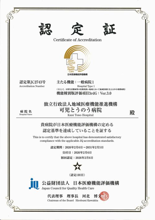 当院は、財団法人日本医療機能評価機構が定める審査を受け、「一般病院1」〈3rdG:Ver.3.0〉 の認定を受けました。
